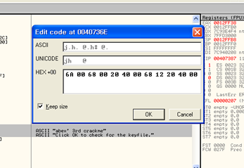 패킹되면서 숨겨졌던 부분을 NOP코드에 stolenbyte의 op코드를 ctrl+E를 이용하여 넣어주었다. Stolen byte는 6A 00 68 00 20 40 00 68 12 20 40 00 이다.