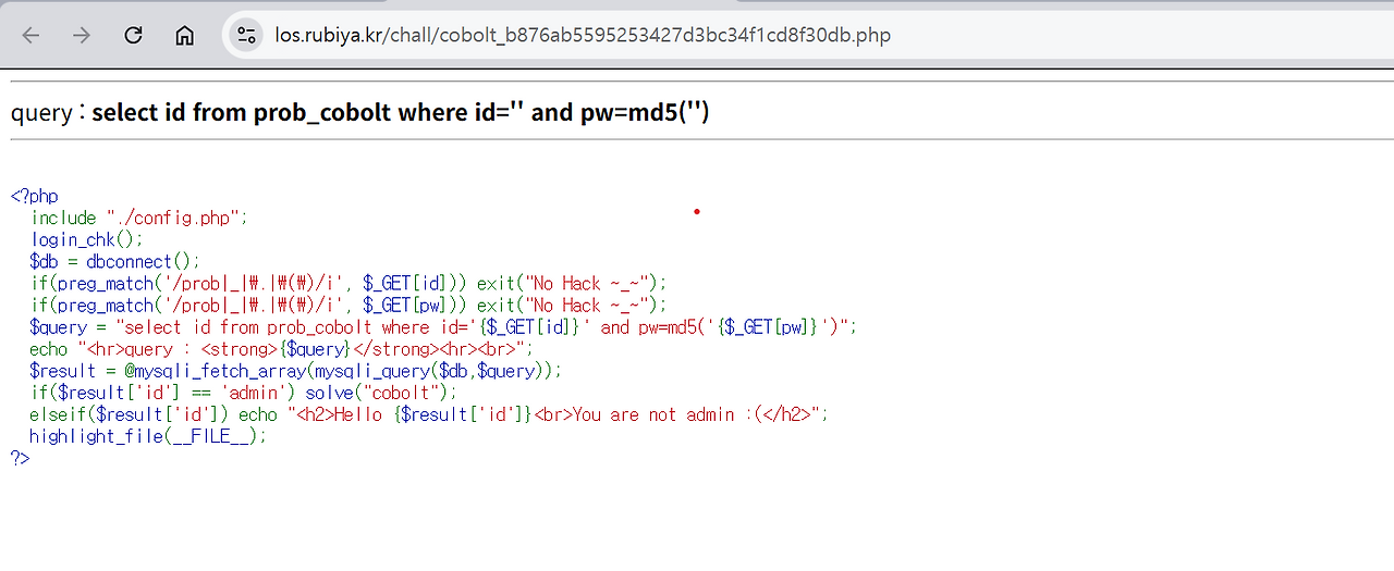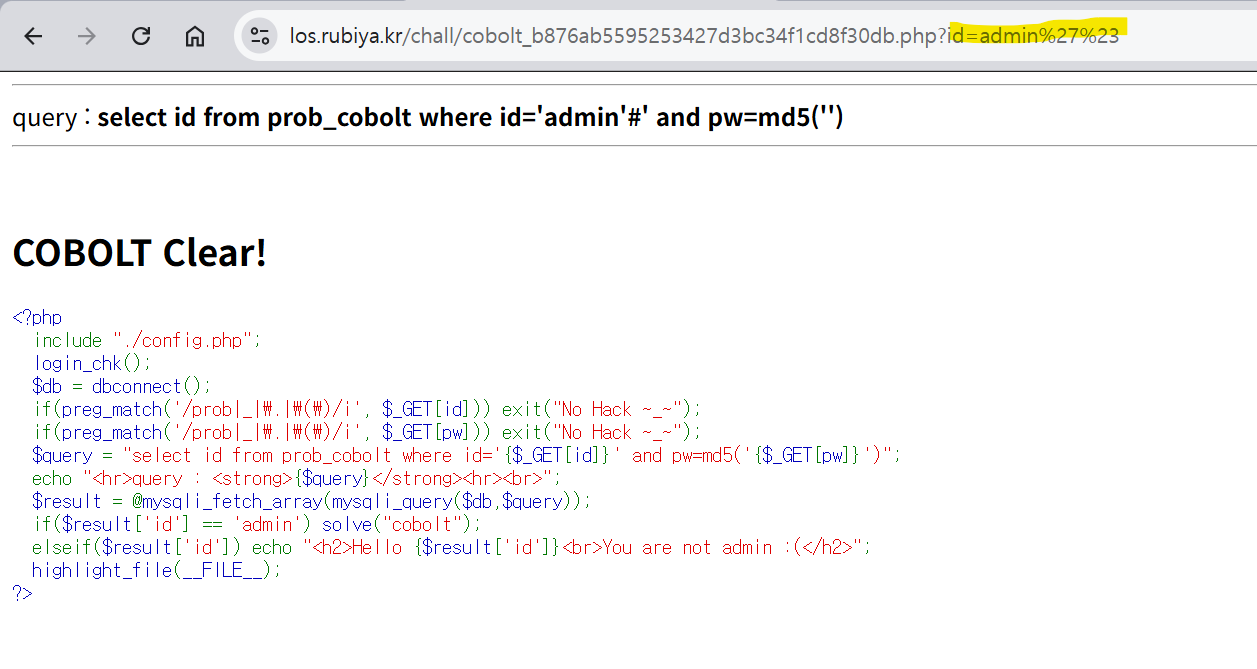 따라서 규칙1처럼 id값은 admin이고 md5로 암호화되는 pw부분은 규칙2를 지켜야하므로 주석처리(#)를 통해 PW인증을 무력화 시켜서 문제를 해결하는 방법을 생각했다.