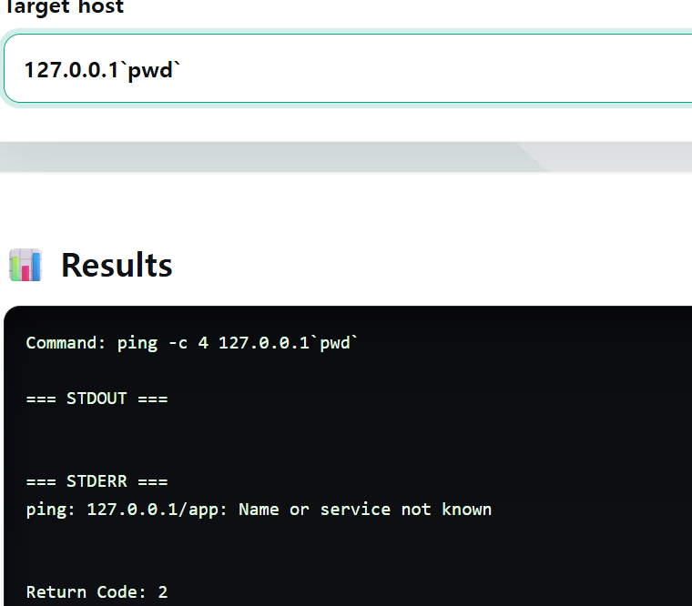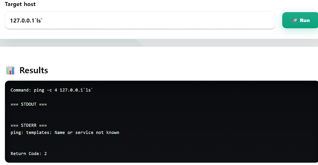 2) 127.0.0.1`ls`로 백틱('안에 있는 명령부터 실행하는 것) 을 시도한다.