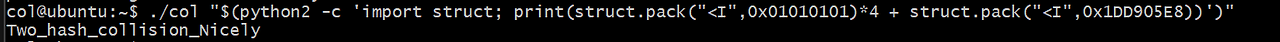 ./col "$(python2 -c 'import struct; print(struct.pack("<I",0x01010101)*4 + struct.pack("<I",0x1DD905E8))')" 를 입력하면