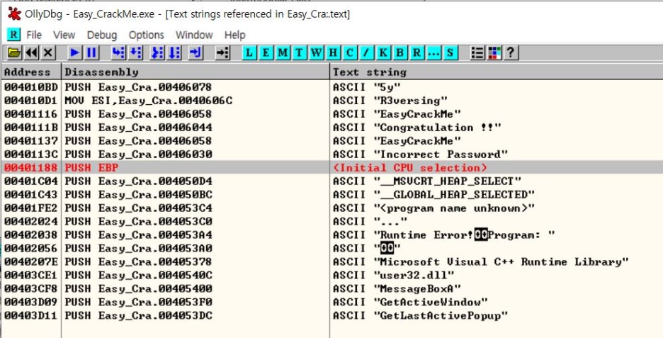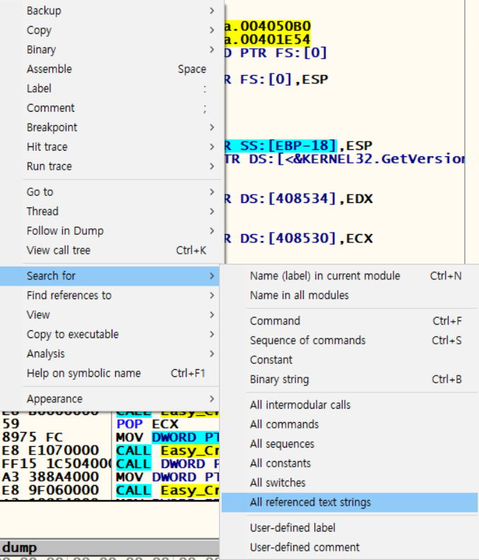 마우스를 우클릭 하여 [Search for] > [All referenced text strings]를 눌러 문자열을 확인한다.