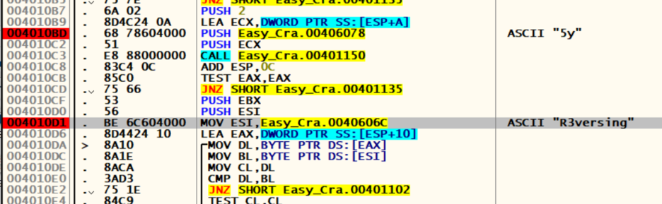 004010D1 부터 다섯 번째 글자부터 끝까지 'R3versing'과 비교를 한다.