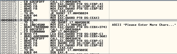 그러나 문제에서 Name은 한 글자라고 했기 때문에 글자수를 확인하는 조건의 수정이 필요하였다. Key에 입력된 메시지 근처에서 글자수를 비교하는 CMP를 찾아보았다.