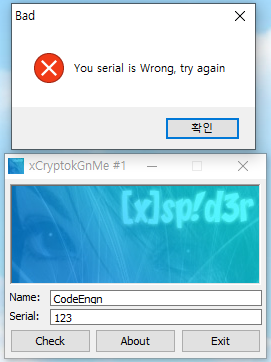 Name으로 CodeEngn을 입력하고 시리얼 값으로 123이라는 임의의 값을 입력하면 실패 메시지가 출력된다.