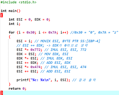 해당 연산을 통해 입력된 Name의 값이 변형이 되어 입력한 Key 값과 비교된다는 것을 알아내었다. 문제에서 제공한 힌트는 Name은 한 자리의 알파벳 또는 숫자가 될 수도 있다는 것이었다. C언어로 해당 연산을 통해 BEDA로 시작하는 문자가 무엇인지 찾아보는 프로그램을 작성하였다.