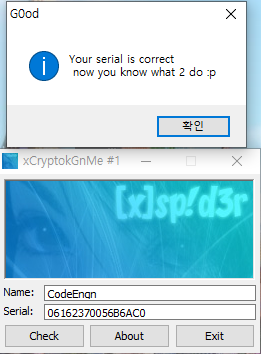 비교 함수를 호출하는 부분에 BP를 설정하고 Name에 CodeEngn, 임의의 시리얼 값을 넣어 실행시킨다. 그러면 String2에 입력된 Name을 통해 연산한 시리얼키가 저장된다. String2의 값을 시리얼 값으로 넣어본다.