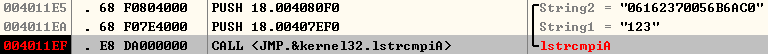 실패문자열의 위치로 이동하면 그 위에 성공 문자열과 분기하는 JE 명령과 문자열 비교함수인 IstrcmpiA를 볼 수 있다.