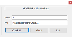 우선 프로그램을 실행해 Name에는 1을, Key에는 BEDA-2F56-BC4F4368-8A71-870B를 넣고 실행하니 글자 수를 더 입력하라는 메시지가 출력되었다.
