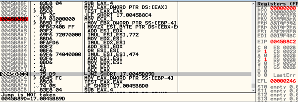해당 함수 0045B850 내부로 들어가 코드를 한 줄씩 실행시켜보았다.