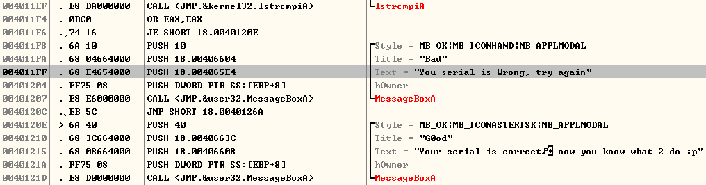 실패문자열의 위치로 이동하면 그 위에 성공 문자열과 분기하는 JE 명령과 문자열 비교함수인 IstrcmpiA를 볼 수 있다.