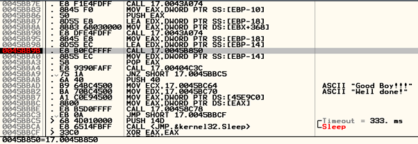 해당 함수 0045B850 내부로 들어가 코드를 한 줄씩 실행시켜보았다.