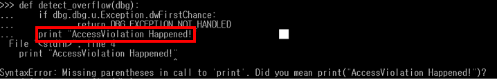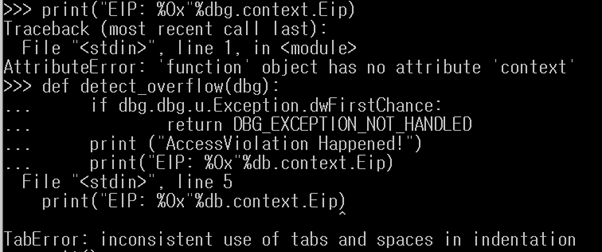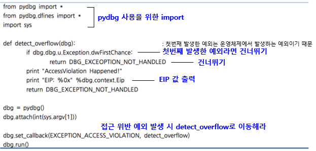 간단하게 짜여진 퍼저 코드를 구현해보는 것을 목표로 하였다. 해당 코드를 간단히 분석해보면, 접근위반 예외가 발생할 시 오버플로우 발생으로 인지하고 detect_overflow 함수로 이동한다. 이때, 첫번째 발생한 예외는 운영체제에서 발생한 예외이기 때문에 건너뛰고 EIP 값 출력하는 프로세스로 진행된다.