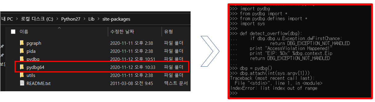 : pydbg64 버전이 pc에 설치되어있어 python 2.7버전의 파일에 넣었더니, pydbg가 정상적으로 import 되었다. 하지만 dbg.attach(int(sys.argv[1])) 부분에서 에러가 발생 -> argv[1]의 인덱스가 맞지 않다는 오류(아직 해결x)
