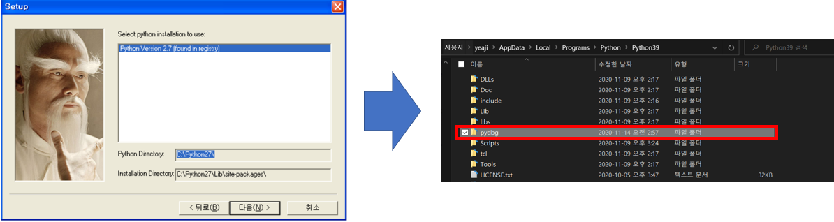 paimei 설치 후에 압축을 풀어 python 경로에 pydbg를 설치(자동으로 경로가 지정되기 때문에 그대로 설치 진행, 설치하려는 버전이 뜨지 않을 경우 exe 파일로 설치하고 파일을 직접 해당 경로로 복사하는 방법)