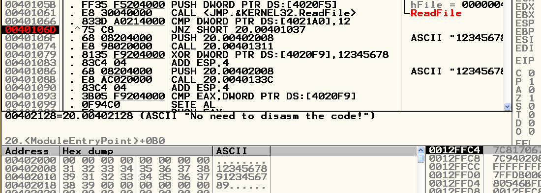 4020F9의 값과 12345678 값과 xor 하고 0040133C 함수를 호출하는 것을 확인.