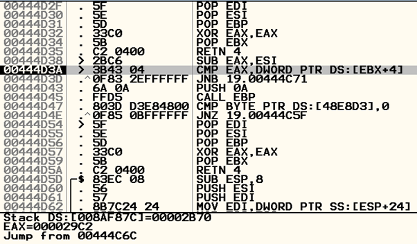 코드를 한 줄씩 실행하다가 00444D38에서 00444D3D가 반복되는 것을 확인할 수 있다. CMP 값에 따라 jump가 결정되는데, 비교되는 값은 00002B70이었다. 16진수 00002B70은 10진수로 11,120이었다.