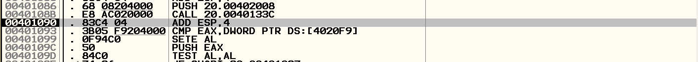 - 41(A) ~ 4F(0) 반복하면서 진행. 실제로 입력한 키 값과 xor을 하여 암호화 한다. 이렇게 암호화 된 값은 4020F9에는 암호화된 값에 총 합이 저장되게 된다. (4F 도달할 때까지 반복하므로 최대 14번 반복)