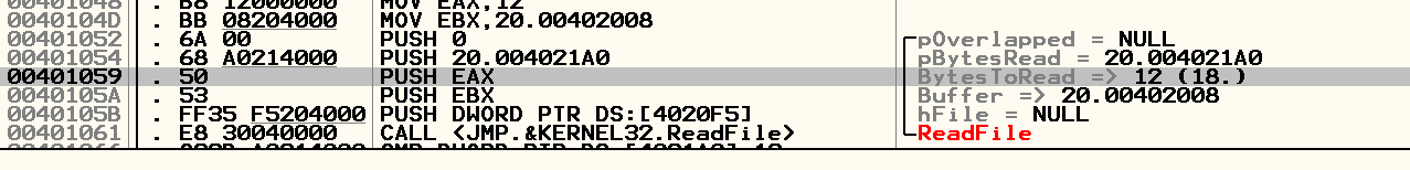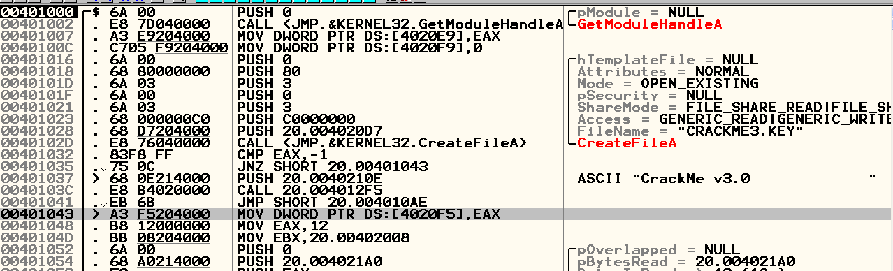 생성 후 실행 결과 ReadFile 명령어로 파일을 읽어서 CRACKME3.KEY 파일에 값을 읽어 오는 것을 볼 수 있다
