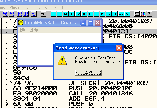변경하고 실행한 결과 메시지 창이 뜨긴 하지만 Code Engn!이란 문구 대신 변조된 값이 출력되는 것을 확인. (어떤 값을 작성하든 뒤의 '!'가 나오는 것을 알 수 있다)