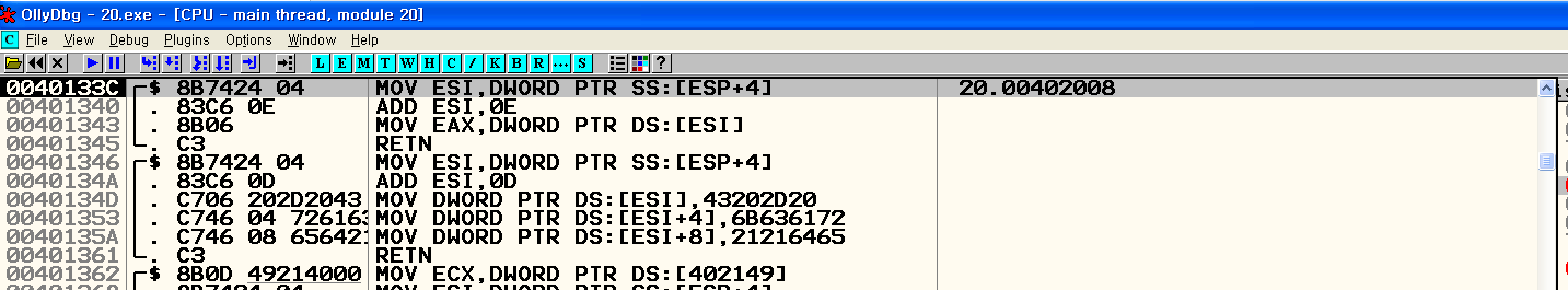- key 값이 들어 있는 ESP+4를 ESI에 입력한다. 그 다음 BL을 0x41로 초기화