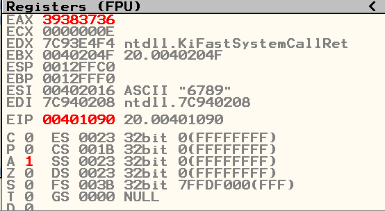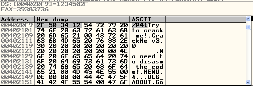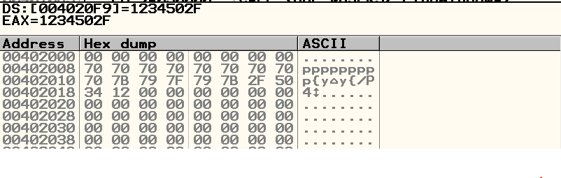 4020F9의 값을 확인해 보면 1234502F이고 EAX 값을 보면 39383736 이고 이 16진수로 아스키 코드로 변환하면 6789임을 알 수 있어 키 입력 값에 마지막 4글자를 가지고 오는 것을 알 수 있다. 이 마지막 4글자를 1234502F로 바꿔준다..
