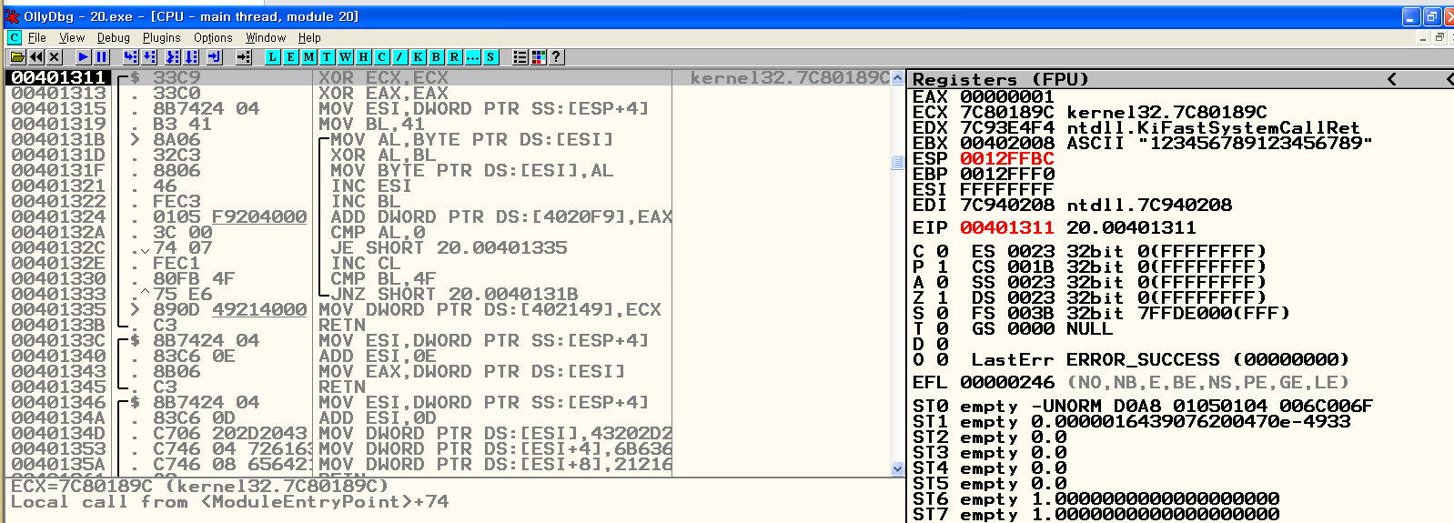 F8로 한 줄씩 실행하다 보면 4020F9 의 4바이트 값과 0x12345678과 xor을 거치면서 키 값이 바뀌는 것을 볼 수 있다. 그런데 마지막 4바이트 6789는 변하지 않은 것을 확인. 401311 위치에 들어가 보았다.