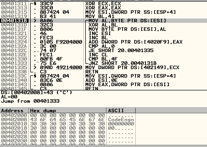 그런데 여기서 앞서 말했던 거와 같이 AL이 0이 아니면 계속 반복하기 때문에 우리가 필요한 CodeEngn을 출력하기 위해서는 이 8 글자 다음에 AL을 0으로 만들어야 한다. 즉 AL과 BL을 xor해서 0이 나와야 한다는 의미로 AL과 BL 값이 같아야 한다. 이 때 BL 값은 49이므로 AL도 49가 된다. Hex editor를 이용해서 수정했다.