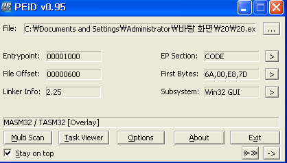 Ollydbg에서 프로그램을 확인하려 했으나 평소 보이던 모습과 달라 PEiD로 확인하니 UPX로 패킹되어 있다는 것을 알 수 있었다. 이에 언패킹을 하고 다시 Ollydbg에서 실행해보았다.