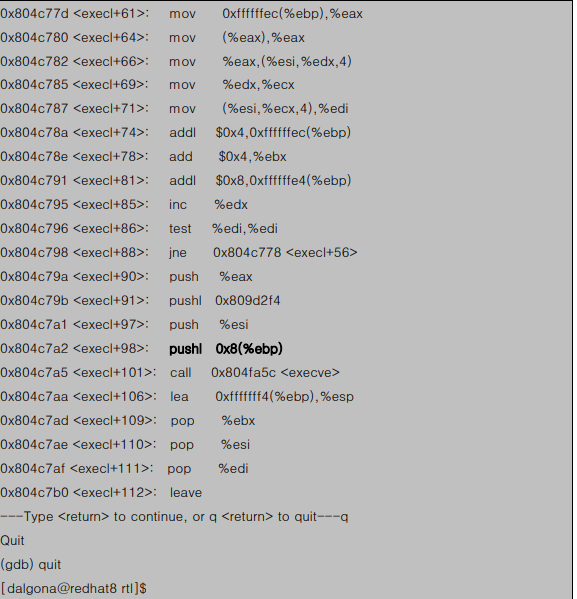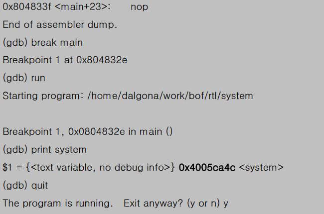 - system() 함수를 보면 함수 프롤로그가 끝난 다음에 mov 0x8(%ebp),%eax 를 수행하는데, 이것이 system() 함수의 argument 처리 과정임.