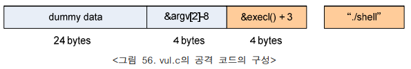 이 구조의 버퍼에 그림 56과 같은 형식의 공격 코드를 집어 넣음.